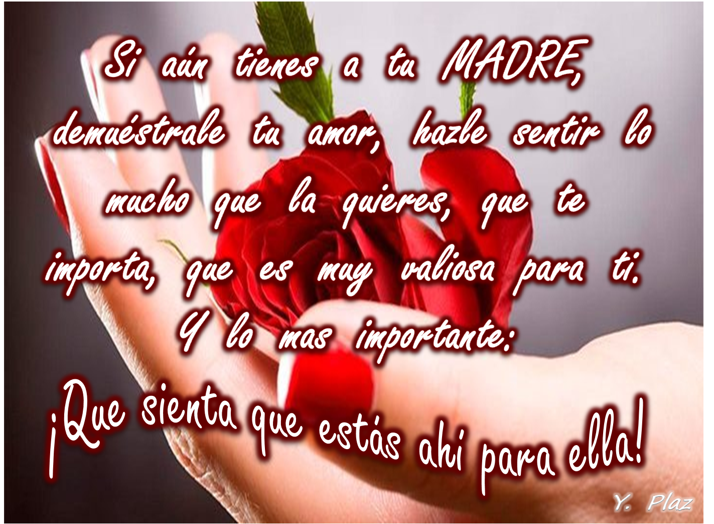 Si aún tienes a tu MADRE, demuéstrale tu amor, hazle sentir lo mucho que la quieres, que te importa, que es muy valiosa para ti. Y lo más importante:          !Que sienta que estás ahí para ella!.