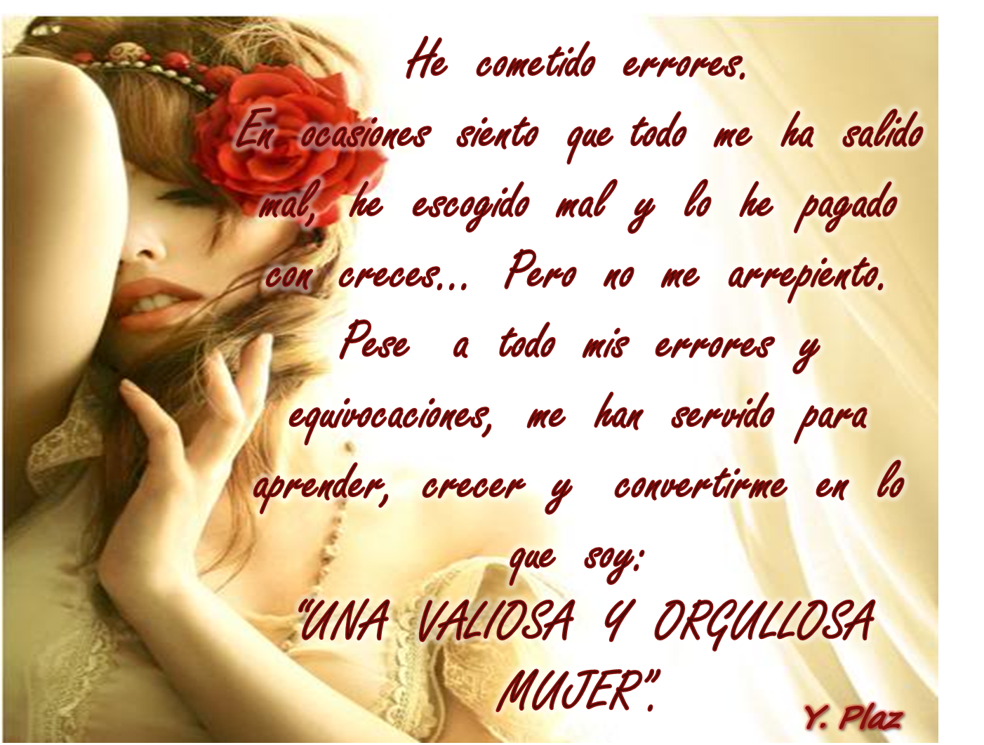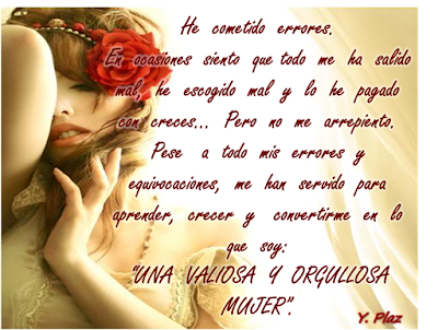 He cometido errores. En ocasiones siento que todo me ha salido mal, he escogido mal y lo he pagado con creces... Pero no me arrepiento. Pese a todo mis errores y equivocaciones, me han servido para aprender, crecer y convertirme en lo que soy: "UNA VALIOSA Y ORGULLOSA MUJER"